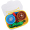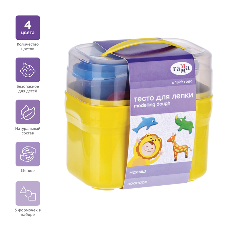 Игровой набор теста для лепки ГАММА серии «Малыш. Зоопарк» развивает воображение и творческие навыки детей. В наборе 4 баночки с тестом основных насыщенных цветов (оранжевый, голубой, лимонный, коричневый), 5 формочек без острых краев из качественного пластика. Набор упакован в пластиковый кейс. Вес теста в одной баночке – 60 г. Тесто на основе натуральных компонентов сертифицировано для детей от трёх лет. Идеально подходит для первых творческих работ: развивает мелкую моторику, усидчивость, координацию движений, пространственное и творческое мышление. Масса безопасна и нетоксична, не пачкает руки, без резкого химического запаха. У теста мягкая податливая текстура — его не нужно предварительно греть и разминать, а для соединения готовых деталей достаточно немного смочить их водой.