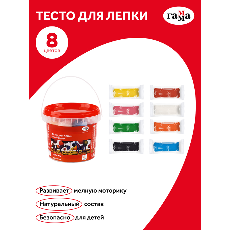 Набор теста для лепки ГАММА серии «Мультики» идеален для детского творчества. Он состоит из 8 брусков, вес каждого – 25 граммов. В наборе 8 основных цветов. Тесто на основе натуральных компонентов сертифицировано для детей от 1 года. Идеально подходит для первых творческих работ: развивает мелкую моторику, усидчивость, координацию движений, пространственное и творческое мышление. Масса безопасна и нетоксична, не пачкает руки.<br/>У теста мягкая текстура – оно легко разминается и хорошо держит форму. Цвета можно смешивать между собой, чтобы получить новые оттенки. Тесто застывает за 24–72 часа, а готовой поделкой можно играть. Тесто для лепки безопасно и не токсично. Набор теста упакован в пластиковую банку с ручкой. Каждый брусок в индивидуальной упаковке. <br/>• Количество цветов: 12;<br/>• Вес нетто: 200 граммов.