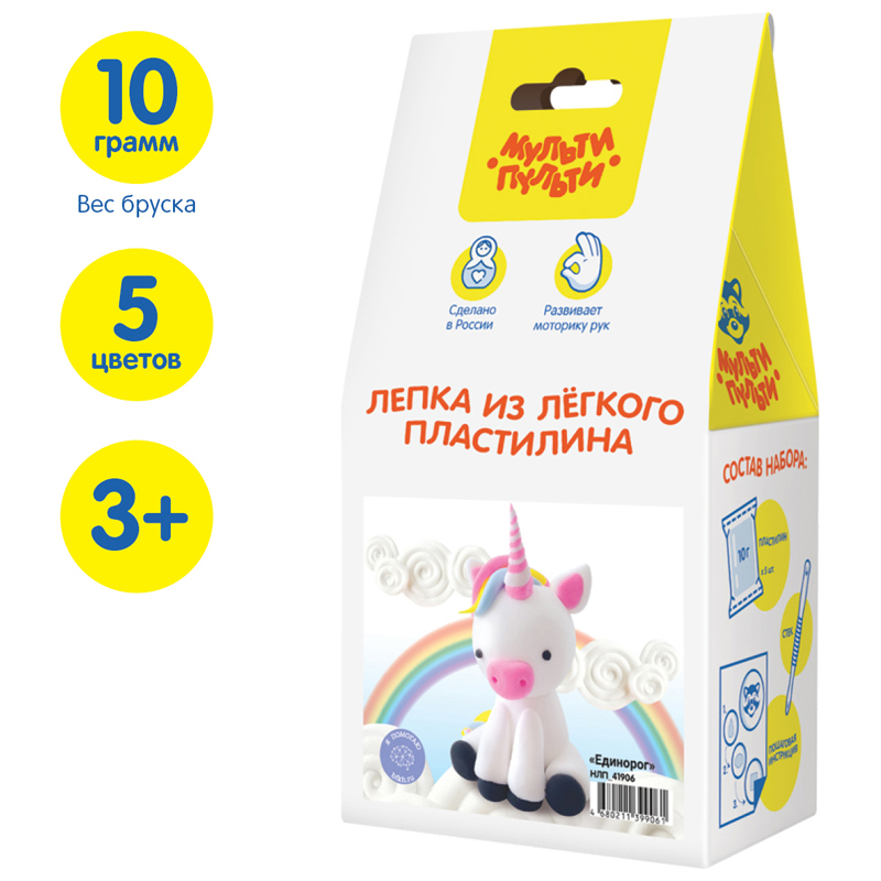 Воздушный пластилин «Мульти-Пульти» – это мягкий, пластичный и приятный материал. В результате работы с набором у вас получится задумчивый единорог. Он станет игрушкой или украшением для детской комнаты. <br/>Пластилин «Мульти-Пульти» не требует предварительного разминания. Цвета легко смешиваются между собой, создавая новые оттенки. Материал полностью высыхает на воздухе и сохраняет форму поделки. Пластилин не пачкает руки, одежду и мебель. Произведён и сертифицирован в России с использованием безопасных для здоровья детей красителей и компонентов. Набор для лепки «Мульти-Пульти» состоит из: пяти пакетиков лёгкого пластилина по 10 г каждый, цветной пошаговой инструкции, стека.<br/>• Количество цветов: 5; <br/>• Вес нетто: 50 г.