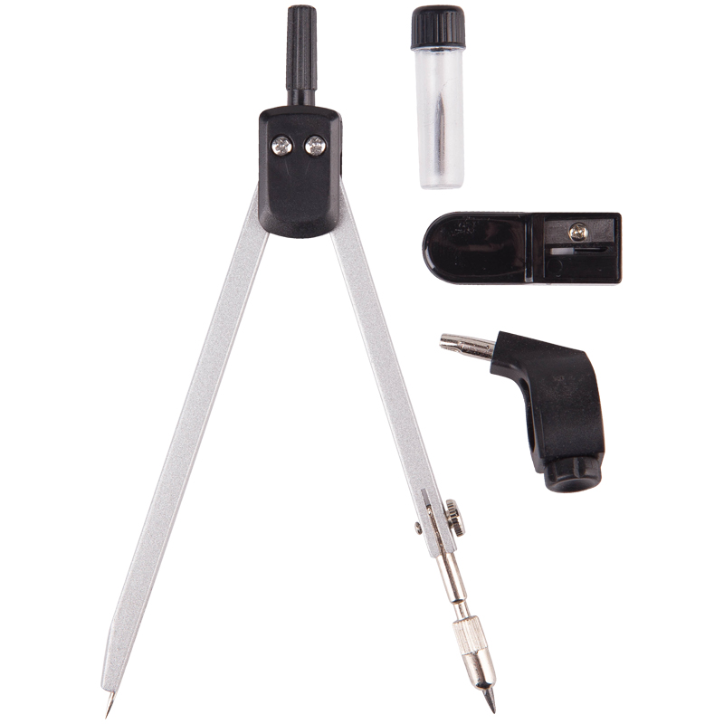 Набор в пластиковом пенале с европодвесом - 4 предмета (циркуль, запасной грифель, точилка и насадка с универсальным держателем). Товар предназначен для чертежно-графических работ.