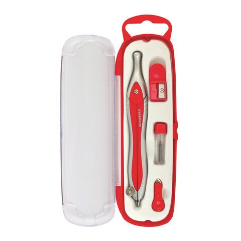 Изготовлена из металла. Основной цвет корпуса - серебристый. Упаковка - пластиковый пенал с европодвесом, который гарантирует безопасность от механических повреждений школьных рюкзаков и сумок. Максимальный диаметр окружности 150 мм.