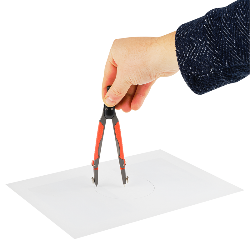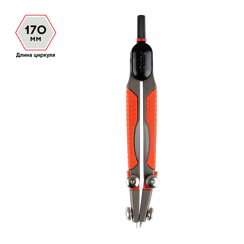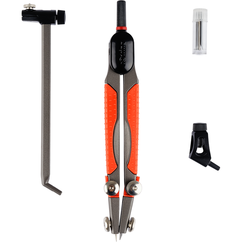 Состав: большой универсальный циркуль, удлинитель, насадка для циркуля с универсальным крепежным приспособлением, рейсфедер, держатель рейсфедера, упаковка стержней, запасная иголка. Дизайн циркуля – это стильное сочетание металлических частей и элементов чёрного и красного цветов. Окружности диаметром до 640 мм. Готовальня упакована в пластиковый пенал с европодвесом.