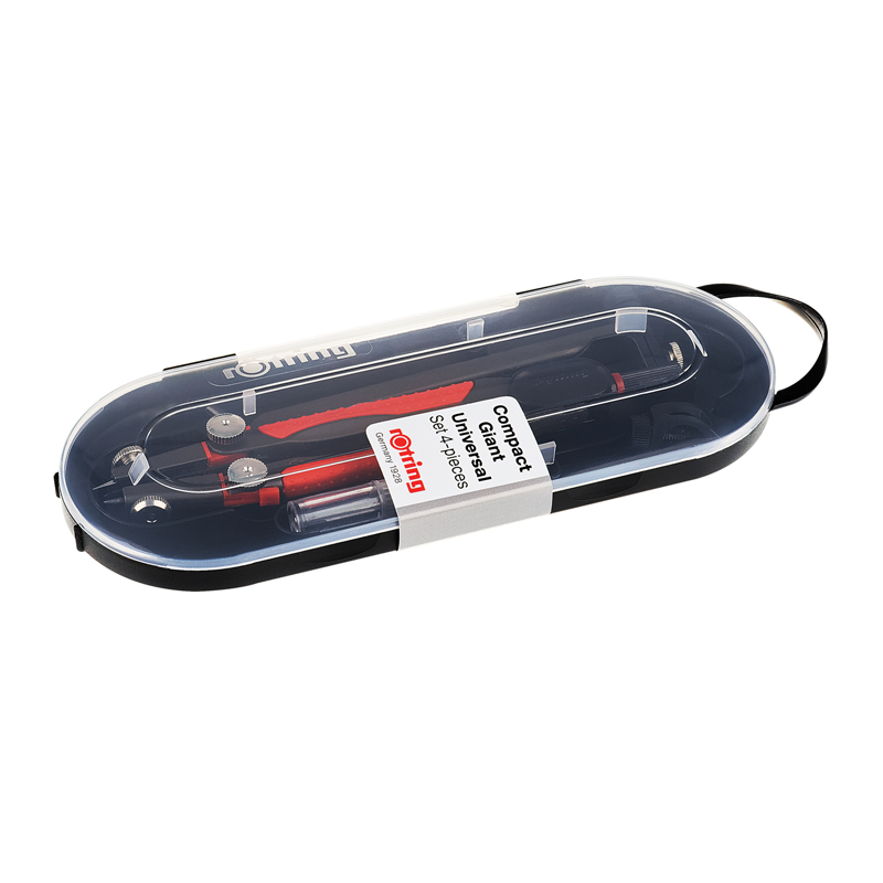 Готовальня Rotring Compact с циркулем из прочного металла<br/>Состав: большой универсальный циркуль, удлинитель, насадка для циркуля с универсальным крепежным приспособлением, рейсфедер, держатель рейсфедера, упаковка стержней, запасная иголка. Дизайн циркуля – это стильное сочетание металлических частей и элементов чёрного и красного цветов. Окружности диаметром до 640 мм. Готовальня упакована в пластиковый пенал с европодвесом.<br/>• Количество предметов: 4;<br/>• Упаковка: пластиковая коробка.