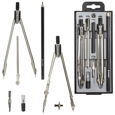 Готовальня для учеников старших классов и студентов. Инструмент отвечает всем требованиям ГОСТа. В комплекте: циркуль стальной никелированный, циркуль разметочный, пенал с запасным грифелем, карандашная вставка, ручка, удлинитель, запасной винт, карандаш.