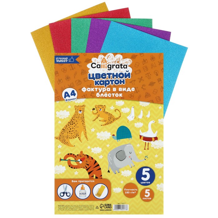 Картон цветной с блёстками, А4, 10 листов, 10 цветов, немелованный, двусторонний, в папке, 250 г/м², Смешарики