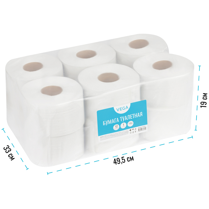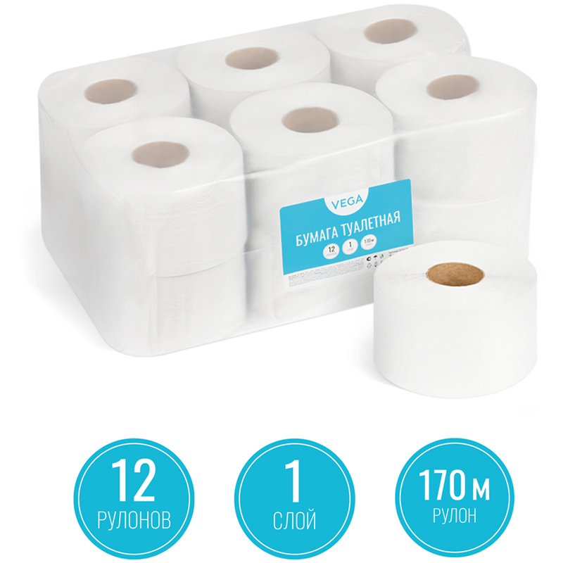 1-слойная туалетная бумага Vega Professional с тиснением подходит для туалетных комнат средней и высокой проходимости. Туалетная бумага изготовлена из переработанного экологически чистого сырья. Сочетается с диспенсерами большинства производителей. Наличие перфорации способствует экономичному расходу бумаги. <br/>Показатели качества и безопасности соответствуют требованиям ГОСТ Р 52354-2005.<br/>длина - 170 м;<br/>состав - макулатура;<br/>количество слоев - 1;<br/>цвет - натуральный;<br/>количество рулонов в упаковке - 12;<br/>размер листа - 9,5*11,5 см;<br/>количество листов - 1 478;<br/>высота рулона - 9,5 см;<br/>диаметр рулона -16,5 см;<br/>наличие тиснения - да;<br/>диаметр втулки - 6 см.<br/>Рекомендуем приобрести диспенсеры ТМ OfficeClean: 274672, 301962.<br/>Продукция OfficeClean - это востребованные товары, сочетающие в себе удобство, простоту и экономичность, сохраняя высокие требования к ключевым характеристикам продукта.