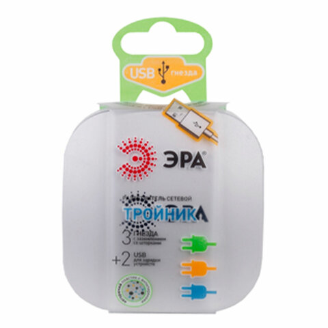 Тройник (адаптер) ЭРА с 3-мя розетками и 2-мя USB гнездами для зарядки портативных устройств. Идеален для зарядки мобильных телефонов и планшетов.