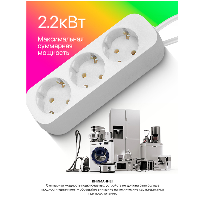Удлинитель электрический на 3 розетки с заземлением. Простой и надежный бытовой удлинитель, который предназначен для электроприборов и использования внутри помещений.Подходит для дома, офиса и коммерческих помещений.