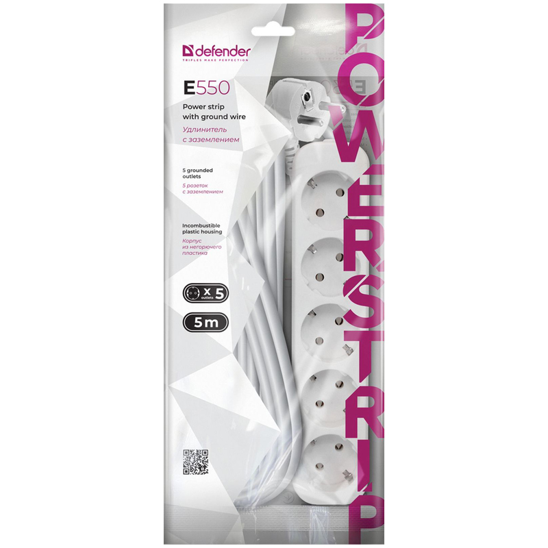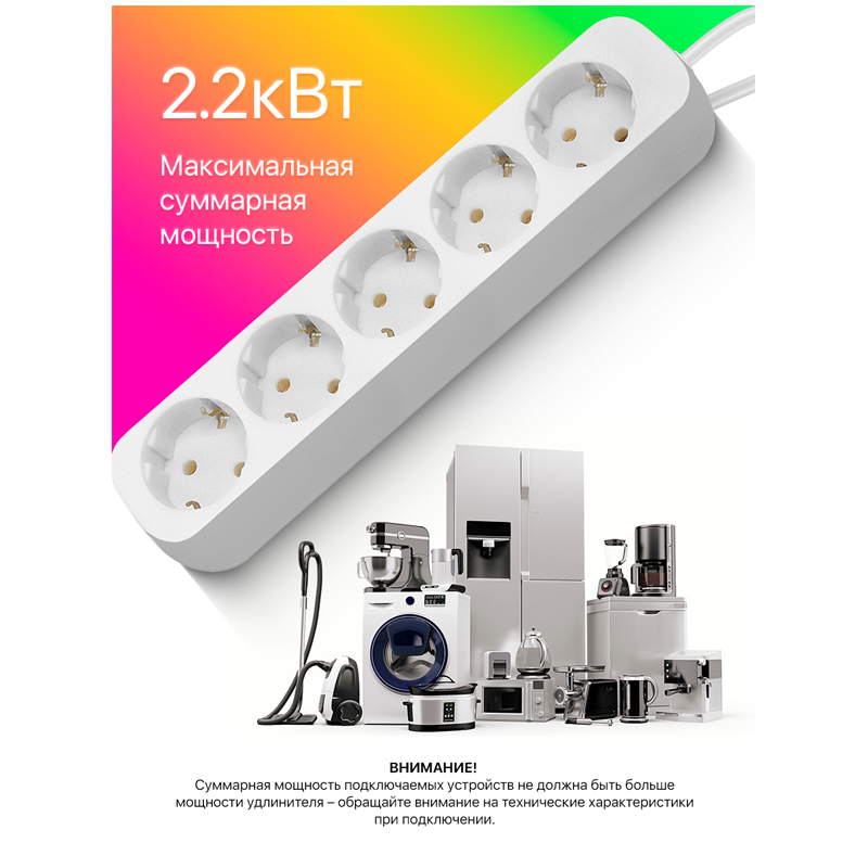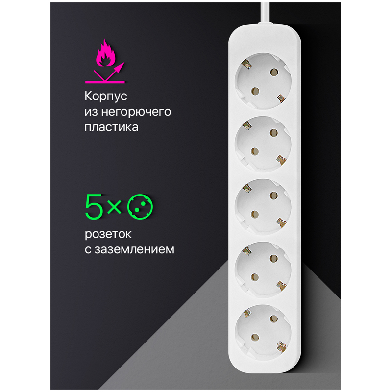 Удлинитель электрический на 5 розеток с заземлением:<br/>Простой и надежный бытовой удлинитель, который предназначен для электроприборов и использования внутри помещений. Подходит для дома, офиса и коммерческих помещений.<br/> Предусмотрена возможность крепления на стену.<br/> Длина провода 5 метров.<br/> Мощность 2200 Вт. Максимальный допустимый ток 10А.<br/> Корпус из негорючего пластика.