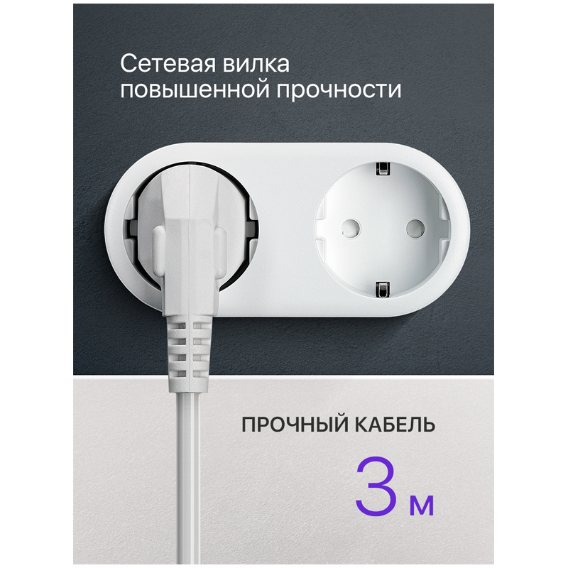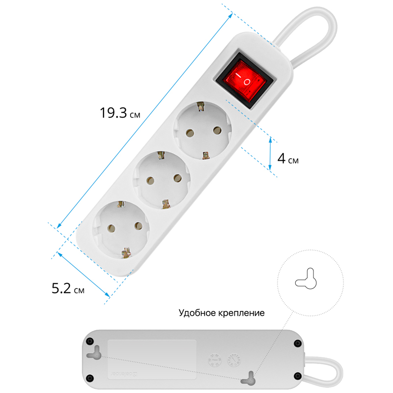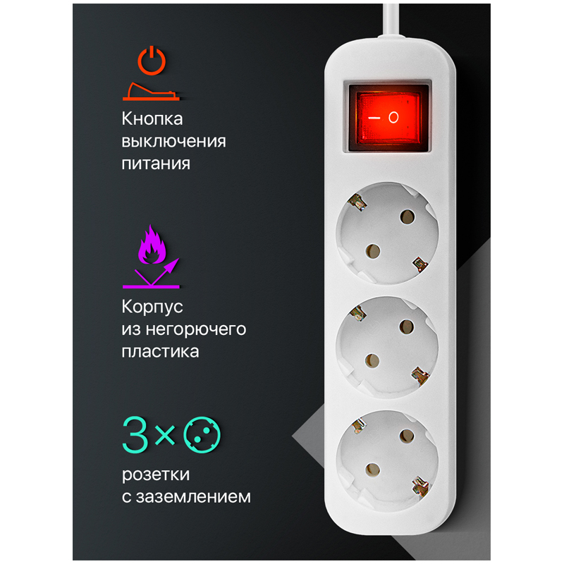 3 розетки с заземлением<br/>Индикатор сети<br/>Корпус из негорючего пластика<br/>Выключатель питания