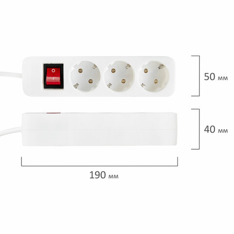 Сетевой удлинитель в пластиковом корпусе оснащен 3 розетками с заземлением. Корпус выполнен из негорючего ABS-пластика. На корпусе расположен выключатель и автоматический предохранитель. Толщина жил кабеля – 3х1,0 мм, длина кабеля – 1,8 м. Материал жил кабеля – алюминий. Номинальная частота – 50 Гц, номинальное напряжение – 220 Вт, максимальный ток нагрузки – 10 А, суммарная мощность нагрузки – 2200 Вт.