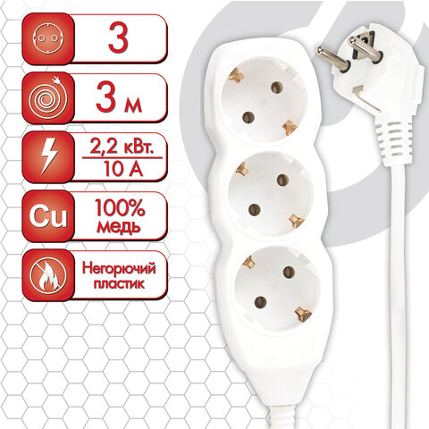 Удлинитель У10-003 3 розетки, с заземлением, с выключателем, 10А, 3 м, белый, 6696