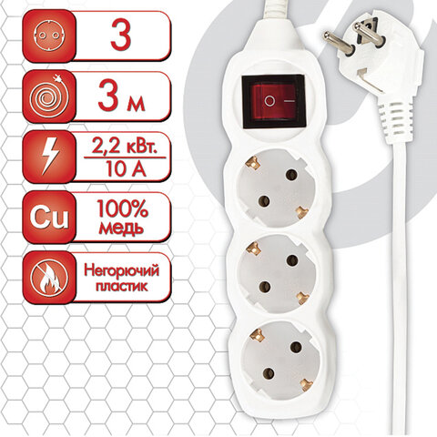 Удлинитель У10-003 3 розетки, с заземлением, с выключателем, 10А, 3 м, белый, 6696