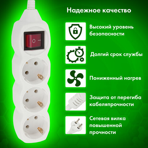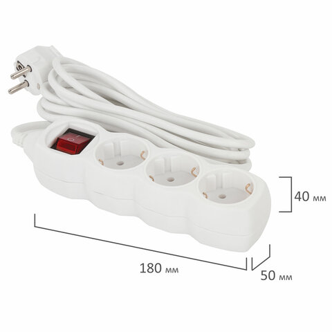 Сетевой удлинитель оснащен 3 евророзетками. Максимальный ток нагрузки подключенных устройств может достигать 10 А. В сочетании, эти параметры позволяют безопасно подключать к удлинителю до 3 электроприборов. Длина кабеля – 3 метра, что позволит использовать удлинитель как внутри помещения, так и снаружи.