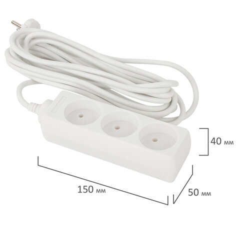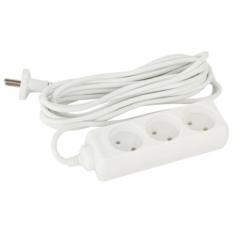 Сетевой удлинитель в пластиковом корпусе оснащен 3 евророзетками без заземления. Максимальный ток нагрузки подключенных устройств может достигать 6 А. В сочетании эти параметры позволяют безопасно подключать к удлинителю до 3 электроприборов. Длина кабеля – 5 метров, что позволит использовать удлинитель как внутри помещения, так и снаружи.