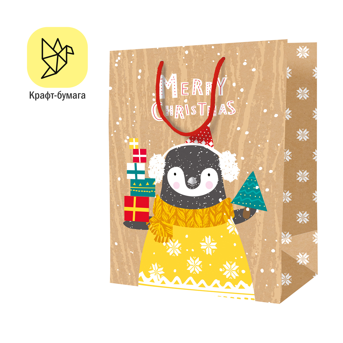Новогодний подарочный пакет ArtSpace The Christmas Penguin выделит презент из массы других. Размер пакета – 18*23*10 см. Пакет изготовлен из крафт-бумаги. Оригинальный дизайн сделает подарок эффектным и запоминающимся. Ручки пакета – прочный шнурок. Эксклюзивный дизайн, превосходное качество и множество отделок – черты, воплотившиеся в подарочных пакетах ArtSpace. Получать подарки всегда приятно, а красиво оформленные – вдвойне. Дарите подарки с любовью!
