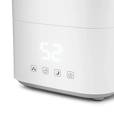 На передней панели расположены кнопки управления: вы можете настроить таймер от 1 до 10 часов, выбрать один из трёх режимов интенсивности тумана и следить за текущим уровнем влажности с помощью встроенного гигрометра. Съёмный резервуар с удобной ручкой позволяет легко наполнять воду как на месте, так и вне устройства.