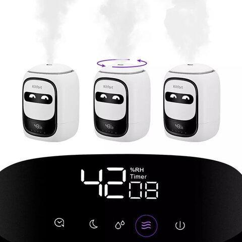 Можно выбирать один из 3 уровней интенсивности тумана. Увлажнитель генерирует не горячий пар, а холодный туман. Частицы тумана мелкие, они обладают большой суммарной поверхностью, а потому быстро испаряются, что приводит к повышению влажности воздуха. Сопло для выхода тумана можно поворачивать на 360°.
