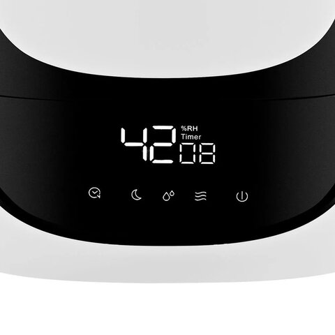 Сенсорное управление, стильный дисплей. Вы можете задавать желаемый уровень влажности от 40 до 90% с шагом 5%, а также время работы увлажнителя - от 1 до 12 ч с шагом 1 ч. На дисплее отображаются текущая влажность и таймер. Вы можете выключить дисплей, воспользовавшись кнопкой “Ночной режим”.