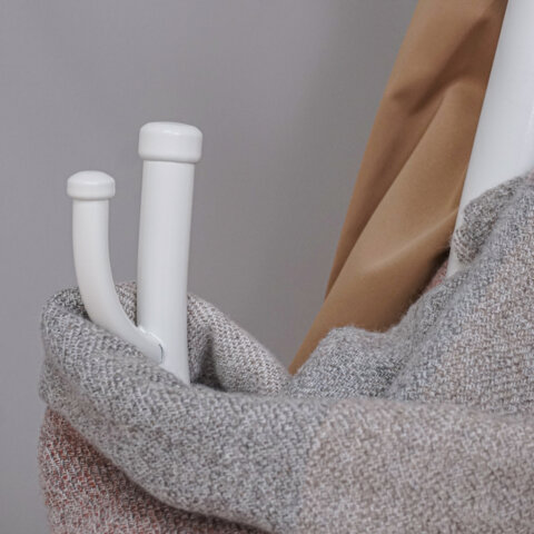 Стойка вешалки выполнена из металла с полимерным покрытием, что обеспечивает стойкость к механическим воздействиям.