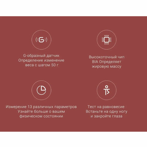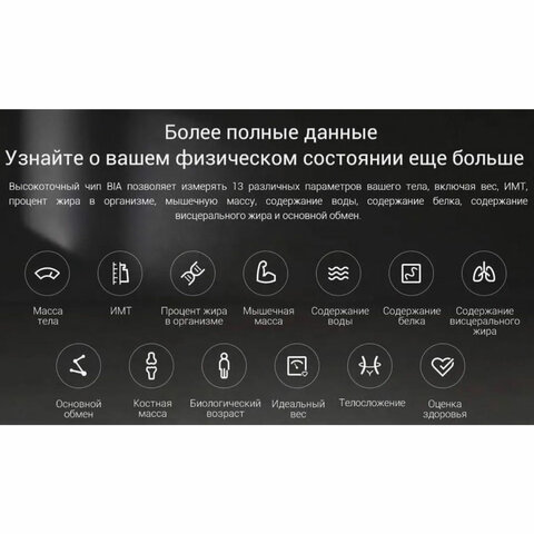 Высокоточный чип BIA позволяет измерять 13 различных параметров вашего тела, включая вес, ИМТ, процент жира в организме, мышечную массу, содержание воды, содержание белка, содержание висцерального жира и основной обмен.