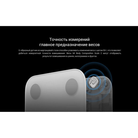 Очевидное достоинство напольных весов XIAOMI Mi Body Composition Scale 2 – точность любых измерений. G-образный датчик из сплава марганца определяет вес с точностью до 50 грамм и легко переводит его в удобную для вас систему мер.