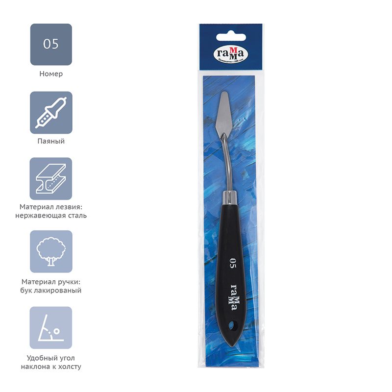 Паяный мастихин из нержавеющей стали с удобной плоской ручкой из натурального бука. Сварное соединение ручки и лезвия дает больший угол наклона мастихина к холсту, снижая вероятность случайного касания и смазывания краски.