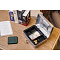 Съемный лоток из ударопрочного пластика с 3 отделениями. Подходит для денег, карточек, ключей, печатей. Под лотком есть пространство, где можно хранить документы и бумаги.