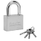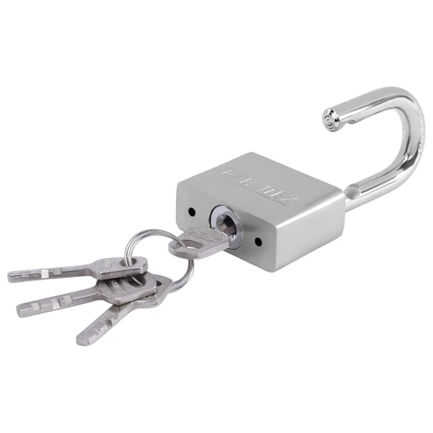 Замок навесной имеет стальной корпус с антикоррозийным покрытием и оснащен полукруглой закалённой стальной дужкой, что делает его прочным и увеличивает сопротивляемость к взлому. Тип механизма секретности – дисковый. Четыре дисковых ключа в комплекте. Замок запирается и открывается при помощи ключа.