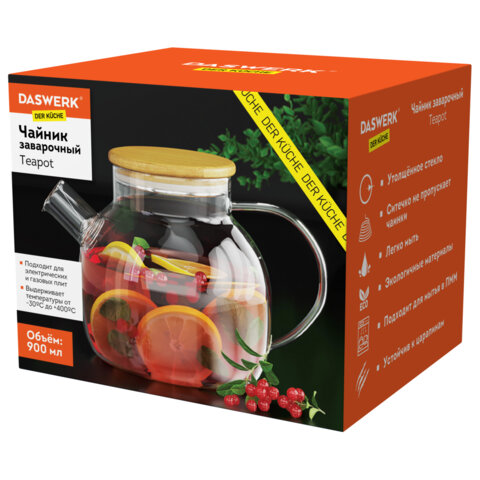 Чайник заварочный 950 мл, жаропрочное стекло, металлическая колба-заварник, DASWERK, 608647