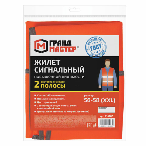 Жилет сигнальный, 2 светоотражающие полосы, ОРАНЖЕВЫЙ, XXXL (60-62), ГРАНДМАСТЕР, 610888
